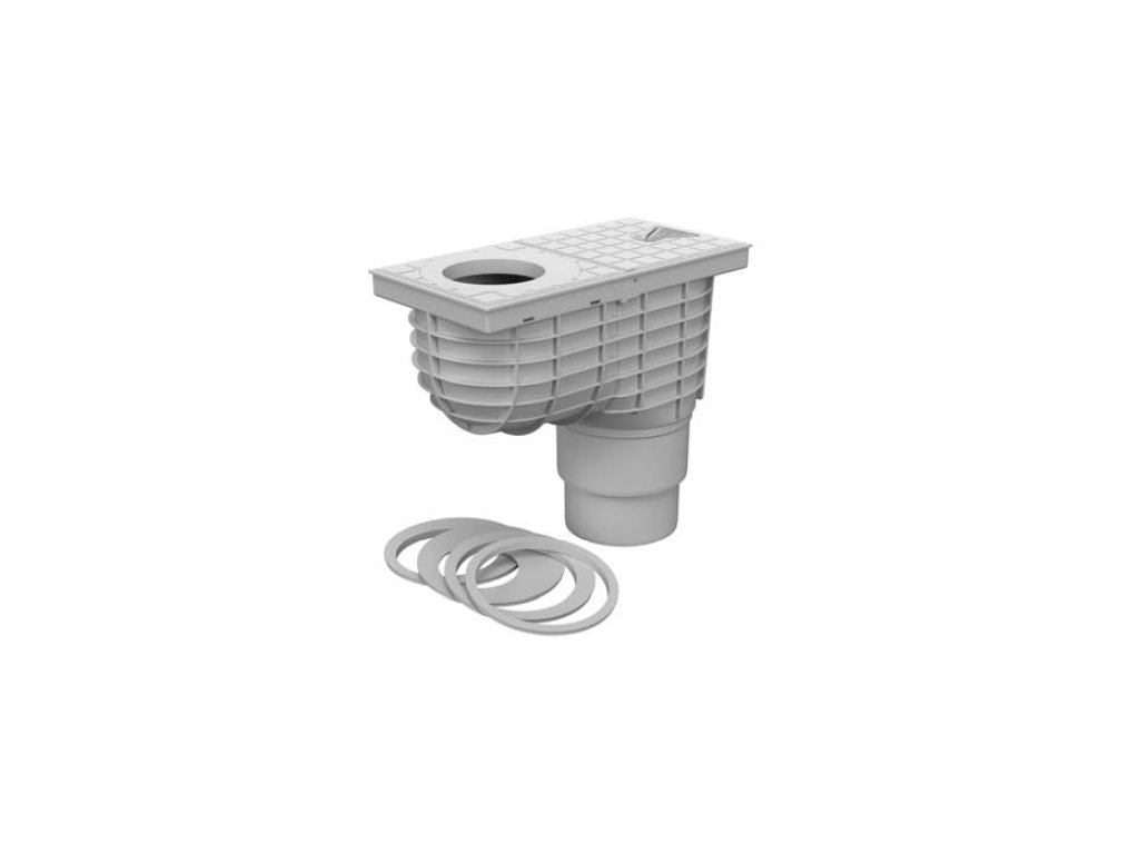 Das Produkt ist für die Ableitung von Regenwasser (Oberflächenwasser) in Kanalisationssysteme außerhalb von Gebäuden bestimmt und ermöglicht den Anschluss von Regenfallrohren. Es enthält eine Trockengeruchsverschlussklappe, die das Zurückströmen von Gerüchen aus dem Kanalisationsrohr verhindert. Der exzentrische Ablaufdeckel der Ausführung STANDARD ist zum Ausschneiden der benötigten Durchmesser 75, 80, 90, 100, 110, 125 mm vorgesehen. Die Version des Ablaufs UNIVERSAL enthält Ringe mit den Nenndurchmessern 75, 80, 90, 100, 110 und 125 mm. Das Produkt hat einen kombinierten Ablauf D 110/125 mm. Hergestellt aus PP und PS mit UV-Stabilisierung. Belastung K3–300 kg, Beständigkeit bis 90°C, geprüft nach EN 1253. Ablaufrost nur auf Bestellung.