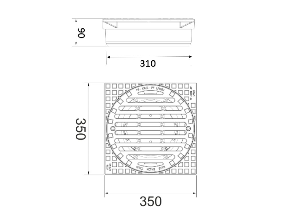 Gusseisenrost B125 350x350mm, für Kunststoffschacht DN400/315 (Teleskop 315mm), Traglast 12,5t. Einlaufrost, quadratischer Rahmen, Sicherung mit zwei Schrauben, ohne Rohr/Teleskop.