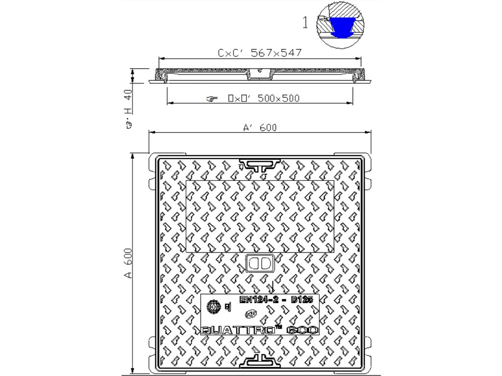 Quadratischer Deckel QUATTRO 600, 600x600mm, Belastung B125, Tragfähigkeit 12,5t