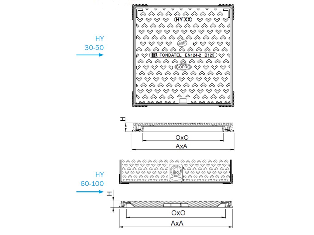 Quadratischer Deckel HY 90, Belastung B125-12,5t. Material: duktiles Gusseisen. Abmessungen: lichte Weite 812 x 772 mm, außen 907 x 907 mm, Höhe: 45 mm, Gewicht 92 kg.
